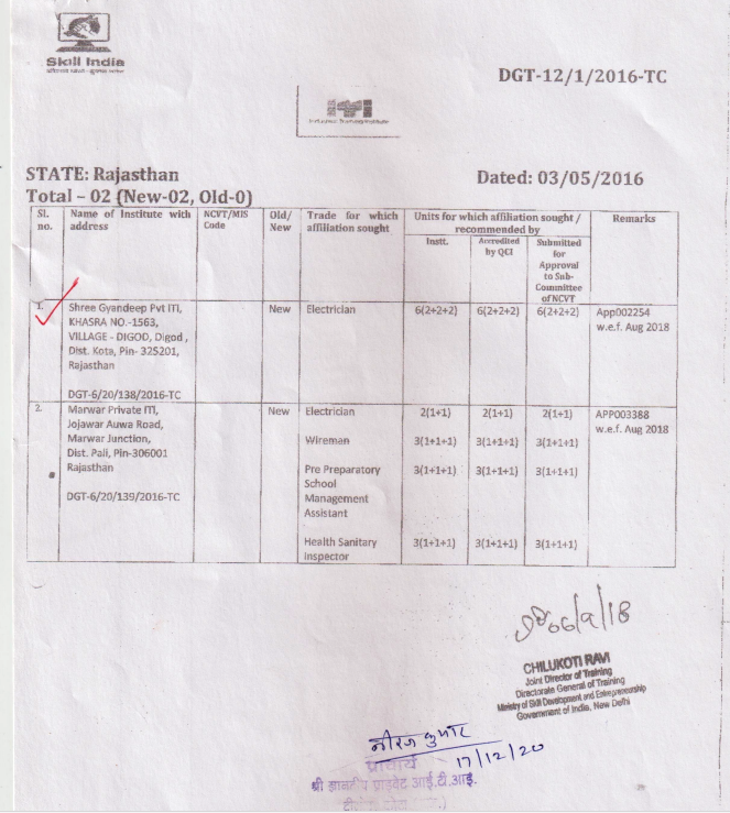 | Name of the Institute | SHREE GYANDEEP PVT.I.T.I DIGOD |